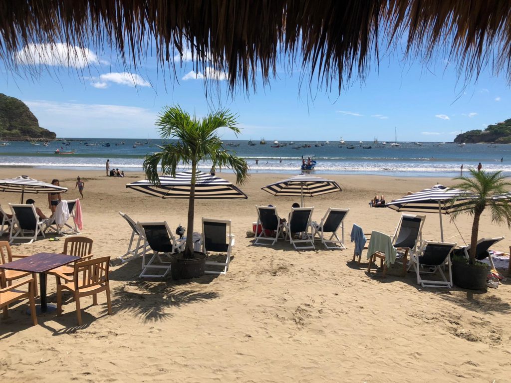 San Juan del Sur heeft een prachtig strand waar het goed vertoeven is. Lekker zwemmen in zee of onder een van de weinige parasolletjes een beetje schaduw zoeken. Het is goed merkbaar dat Nicaragua niet toeristisch is, want er zijn maar weinig strandgangers. Nicaragua ligt recht onder de evenaar, dus de zon staat recht boven ons.